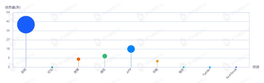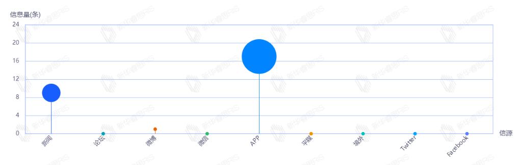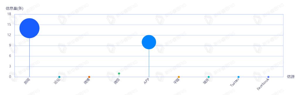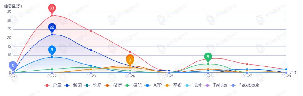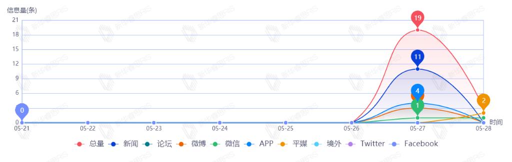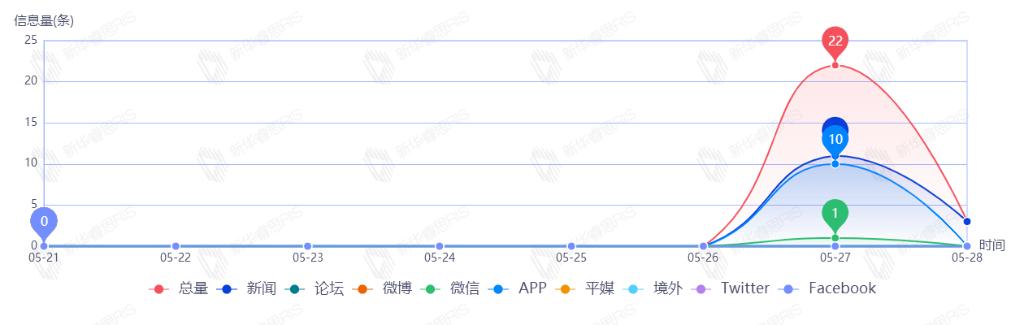 截至目前,该文章在互联网上传播总量22篇。其中5月27日是传播的高峰期,共传播19篇文章。各信源的信息发布情况中,新闻信息占比最大,其次是APP和微博,占比分别为50.00%、18.18%、13.64%。(数据来源:新华睿思数据云图分析平台)