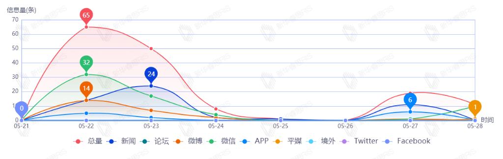 截至目前,该文章在互联网上传播总量154篇。其中5月22日是传播的高峰期,共传播65篇文章。各信源的信息发布情况中,微信信息占比最大,其次是新闻和微博,占比分别为41.56%、33.77%、15.58%。(数据来源:新华睿思数据云图分析平台)