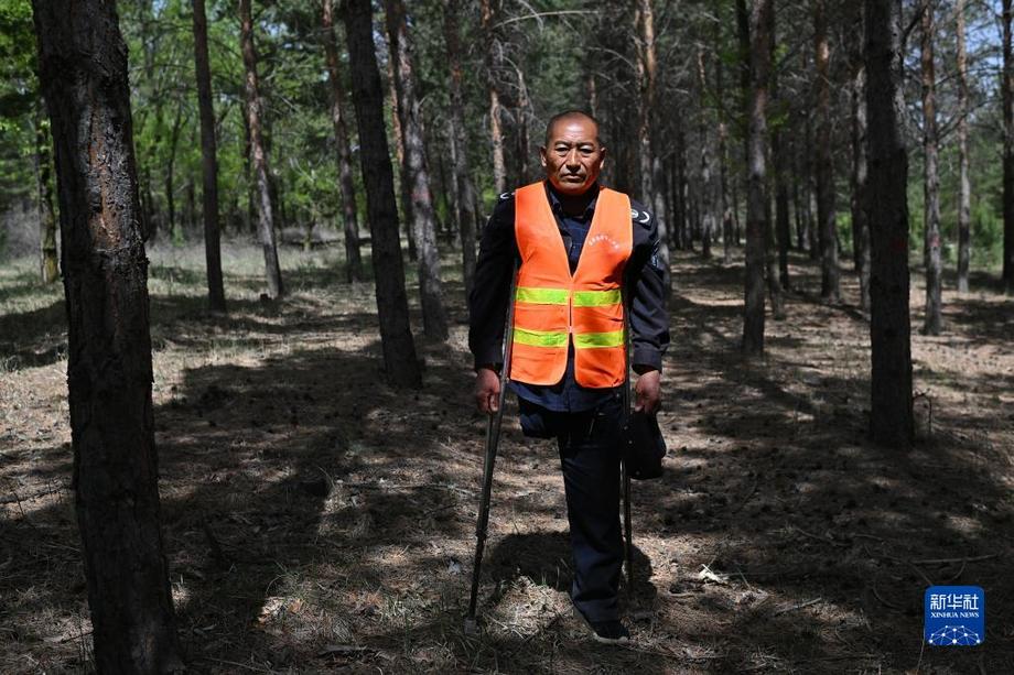 今年54岁的马裕是山西省桑干河杨树丰产林实验局梁家油坊中心林场九连山分区的一名护林员。12岁时因为一场意外失去了右腿,马裕选择坚强地直面逆境,25岁开始当护林员的他,用拐杖和左腿丈量林场的沟沟岔岔,练就了一双“火眼金睛”,也练就了“铁腿”。在这片林海里,一守就是29年。(新华社记者 詹彦)