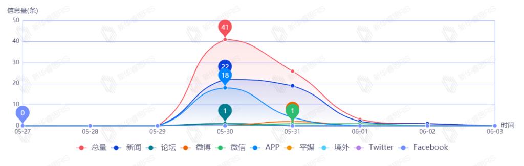 截至目前,该文章在互联网上传播总量共71篇。其中,5月30日是传播的高峰期,共传播41篇文章。各信源的信息发布情况中,新闻信息占比最大,其次是APP和微信,占比分别为61.97%、30.99%、2.82%。(数据来源:新华睿思数据云图分析平台)