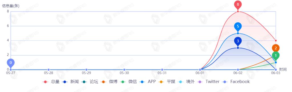 截至目前,该文章在互联网上传播总量共12篇。其中,6月2日是传播的高峰期,共传播8篇文章。各信源的信息发布情况中,APP信息占比最大,其次是新闻和微博,占比分别为50.00%、25.00%、16.67%。(数据来源:新华睿思数据云图分析平台)