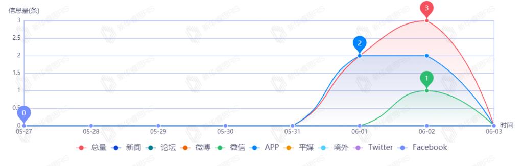 截至目前,该文章在互联网上传播总量共5篇。其中,6月2日是传播的高峰期,共传播3篇文章。各信源的信息发布情况中,APP信息占比最大,其次是微信,占比分别为80.00%、20.00%。(数据来源:新华睿思数据云图分析平台)