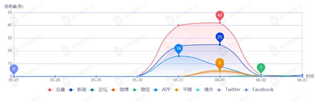 截至目前,该文章在互联网上传播总量共84篇。其中,6月1日是传播的高峰期,共传播42篇文章。各信源的信息发布情况中,新闻信息占比最大,其次是APP和平媒,占比分别为59.52%、28.57%、5.95%。(数据来源:新华睿思数据云图分析平台)