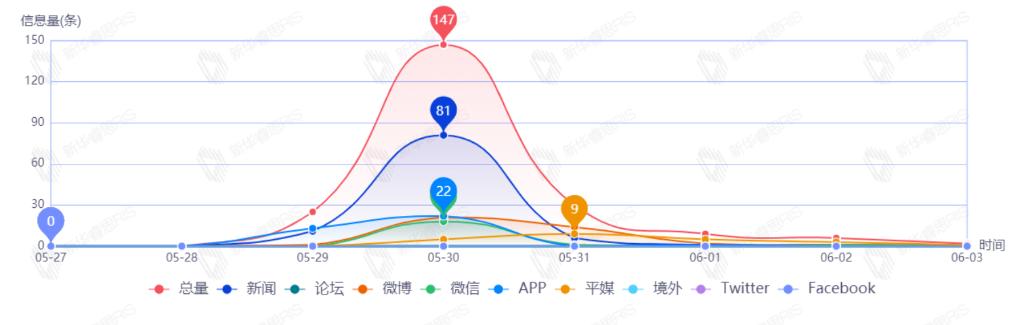 截至目前,该文章在互联网上传播总量共219篇。其中,5月30日是传播的高峰期,共传播147篇文章。各信源的信息发布情况中,新闻信息占比最大,其次是微博和APP,占比分别为45.66%、18.26%、16.44%。(数据来源:新华睿思数据云图分析平台)