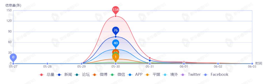 截至目前,该文章在互联网上传播总量共157篇。其中,5月30日是传播的高峰期,共传播134篇文章。各信源的信息发布情况中,新闻信息占比最大,其次是APP和微博,占比分别为56.05%、26.11%、10.83%。(数据来源:新华睿思数据云图分析平台)
