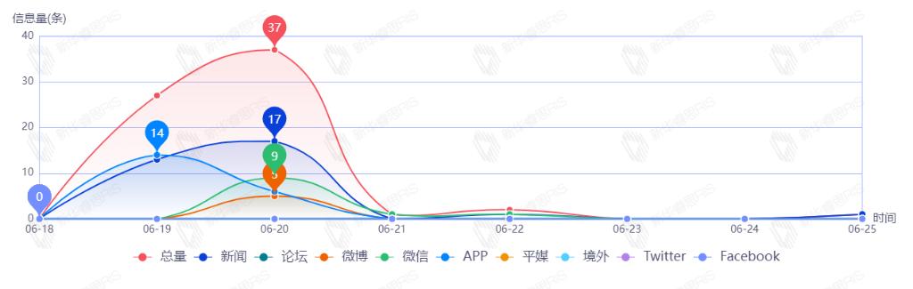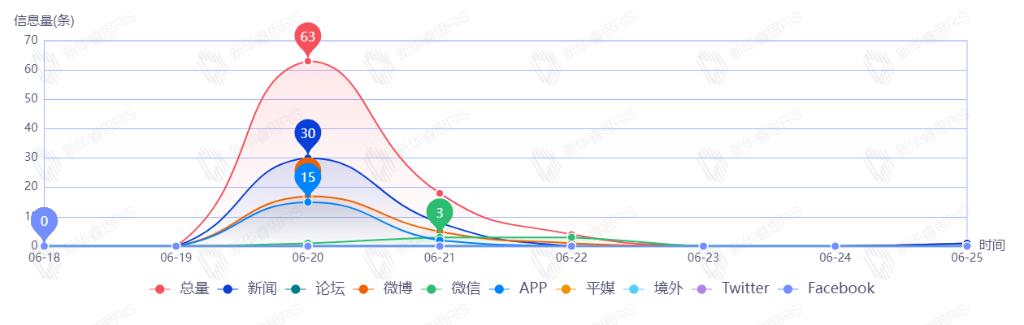 截至目前,该文章在互联网上传播总量共15篇。其中,6月20日是传播的高峰期,共传播12篇文章。各信源的信息发布情况中,新闻信息占比最大,其次是APP和微信,占比分别为53.33%、20.00%、13.33%。(数据来源:新华睿思数据云图分析平台)