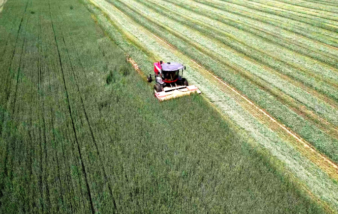 初夏时节,位于山西省晋中市灵石县段纯镇的一片广袤农田里,绿油油的饲用小黑麦随风摇曳,收割机来回穿梭。很难想象,这里曾是一片废弃矿山。(新华社记者魏飚)