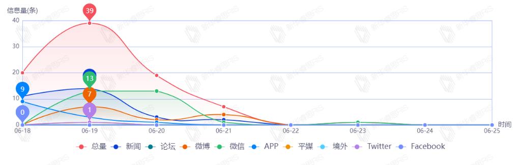 截至目前,该文章在互联网上传播总量共86篇。其中,6月19日是传播的高峰期,共传播39篇文章。各信源的信息发布情况中,新闻信息占比最大,其次是微信和微博,占比分别为34.88%、32.56%、15.12%。(数据来源:新华睿思数据云图分析平台)
