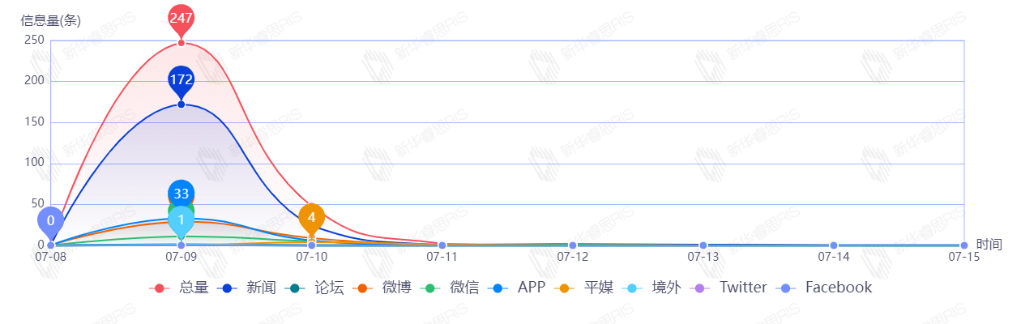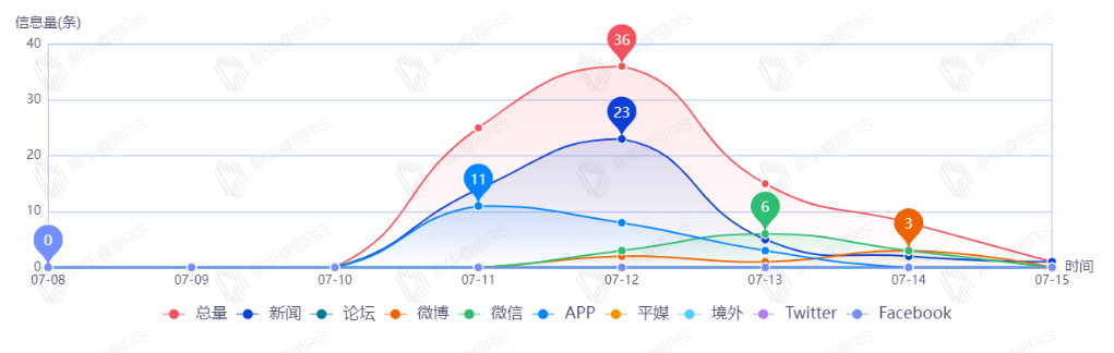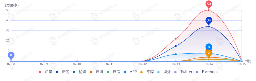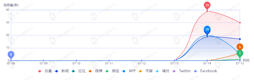 截至目前,该文章在互联网上传播总量共69篇。其中,7月14日是传播的高峰期,共传播39篇文章。各信源的信息发布情况中,新闻信息占比最大,其次是APP和微博,占比分别为52.17%、36.23%、8.70%。(数据来源:新华睿思·数媒智慧分析平台)