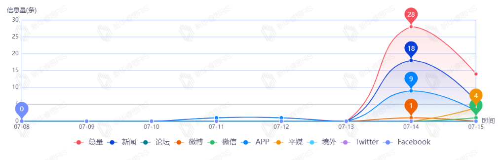 截至目前,该文章在互联网上传播总量共44篇。其中,7月14日是传播的高峰期,共传播28篇文章。各信源的信息发布情况中,新闻信息占比最大,其次是APP和平媒,占比分别为54.55%、31.82%、9.09%。(数据来源:新华睿思·数媒智慧分析平台)