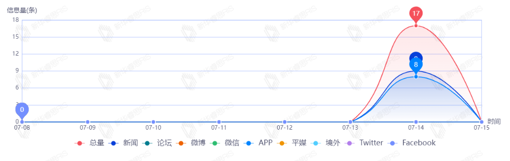 截至目前,该文章在互联网上传播总量共17篇。其中,7月14日是传播的高峰期,共传播17篇文章。各信源的信息发布情况中,新闻信息占比最大,其次是APP,占比分别为52.94%、47.06%。(数据来源:新华睿思·数媒智慧分析平台)