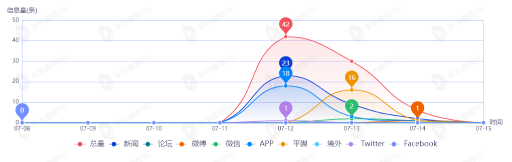 截至目前,该文章在互联网上传播总量共78篇。其中,7月12日是传播的高峰期,共传播42篇文章。各信源的信息发布情况中,新闻信息占比最大,其次是APP和平媒,占比分别为43.59%、28.21%、21.79%。(数据来源:新华睿思·数媒智慧分析平台)