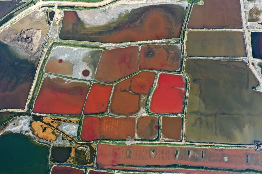 夏日时节,随着气温不断升高,山西运城盐湖呈现出色彩斑斓的景象。从空中俯瞰,犹如天然“调色盘”。