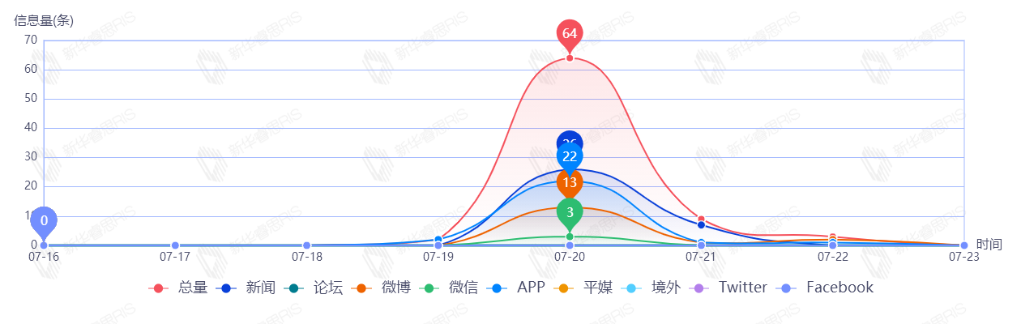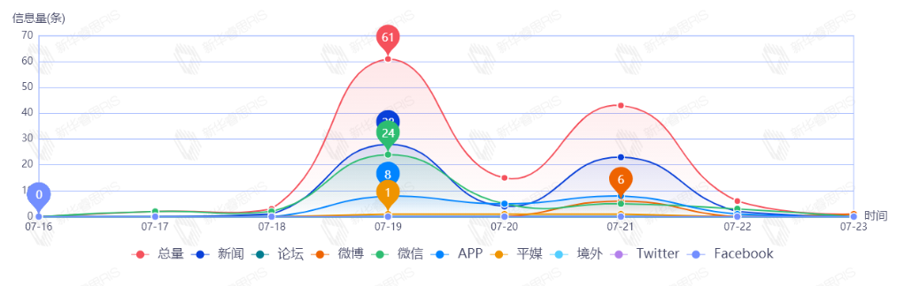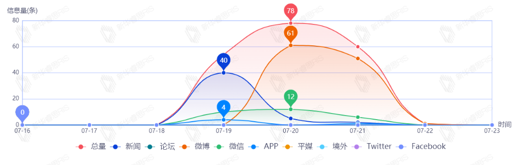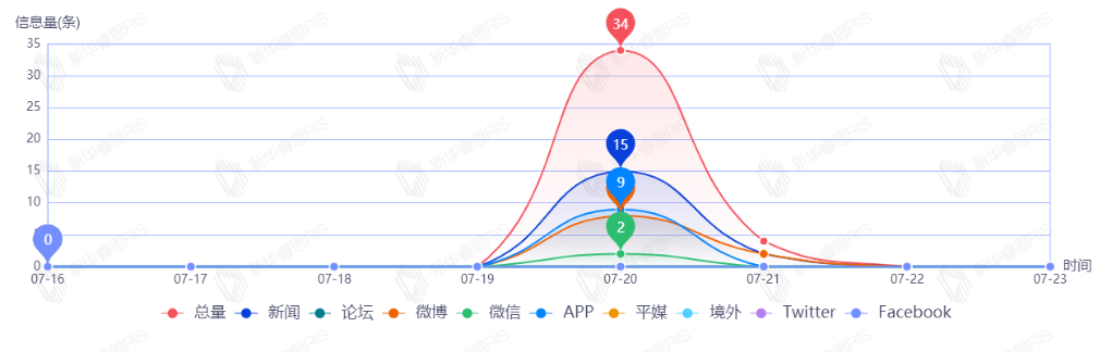 截至目前,该文章在互联网上传播总量38篇。其中7月20日是传播的高峰期,共传播34篇文章。各信源的信息发布情况中,APP信息占比最大,新闻信息占比最大,其次是微博和APP,占比分别为44.74%、26.32%、23.68%。(数据来源:新华睿思数据云图分析平台)