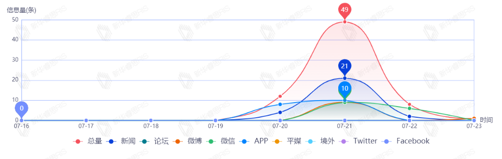 截至目前,该文章在互联网上传播总量70篇。其中7月21日是传播的高峰期,共传播49篇文章。各信源的信息发布情况中,新闻信息占比最大,其次是APP和微信,占比分别为38.57%、25.71%、21.43%。(数据来源:新华睿思数据云图分析平台)