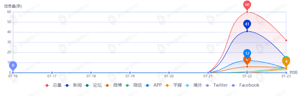 截至目前,该文章在互联网上传播总量92篇。其中7月22日是传播的高峰期,共传播60篇文章。各信源的信息发布情况中,新闻信息占比最大,其次是APP和微博,占比分别为59.78%、17.39%、11.96%。(数据来源:新华睿思数据云图分析平台)