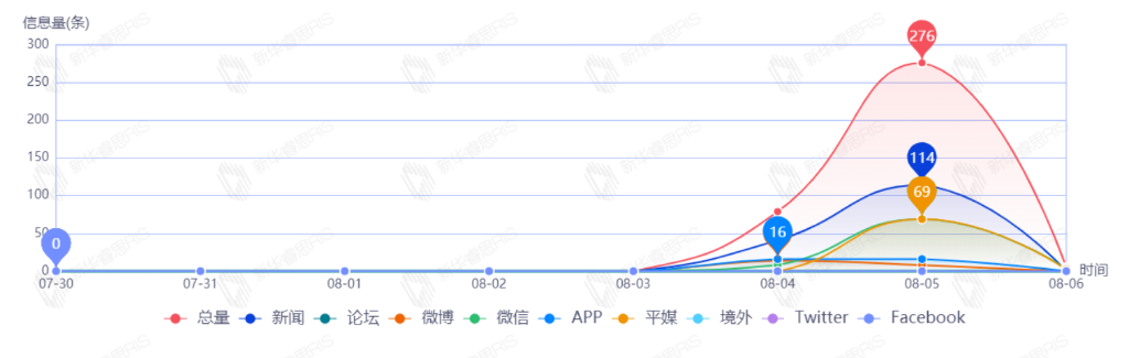 截至目前,该文章在互联网上传播总量共360篇。其中,8月5日是传播的高峰期,共传播276篇文章。各信源的信息发布情况中,新闻信息占比最大,其次是微信和平媒,占比分别为43.06%、22.22%、19.72%。(数据来源:新华睿思·数媒智慧分析平台)