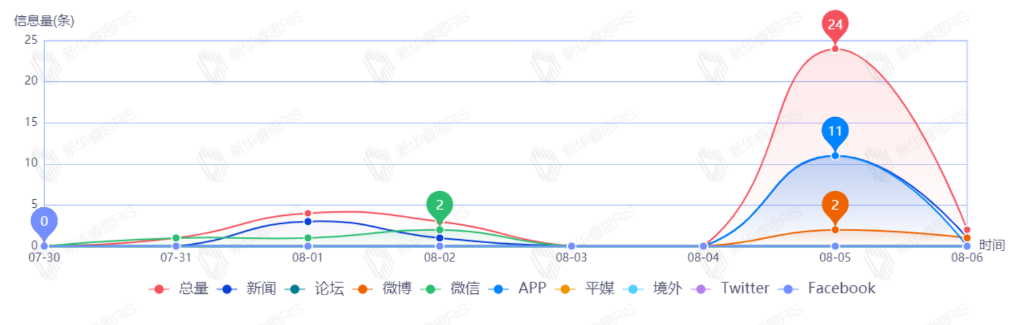 截至目前,该文章在互联网上传播总量共34篇。其中,8月5日是传播的高峰期,共传播24篇文章。各信源的信息发布情况中,新闻信息占比最大,其次是APP和微信,占比分别为47.06%、32.35%、11.76%。(数据来源:新华睿思·数媒智慧分析平台)