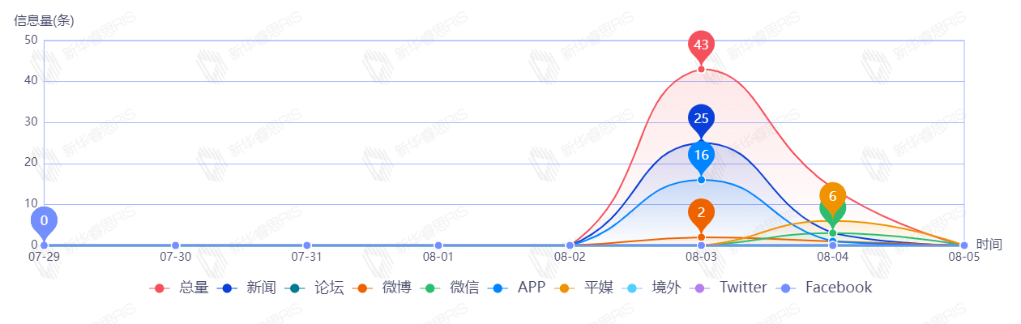 截至目前,该文章在互联网上传播总量共57篇。其中,8月3日是传播的高峰期,共传播43篇文章。各信源的信息发布情况中,新闻信息占比最大,其次是APP和平媒,占比分别为49.12%、29.82%、10.53%。(数据来源:新华睿思·数媒智慧分析平台)
