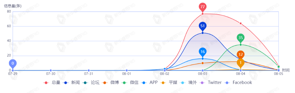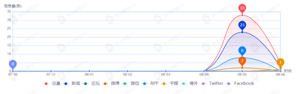截至目前,该文章在互联网上传播总量共37篇。其中,8月5日是传播的高峰期,共传播33篇文章。各信源的信息发布情况中,新闻信息占比最大,其次是APP和微博,占比分别为67.57%、21.62%、5.41%。(数据来源:新华睿思·数媒智慧分析平台)