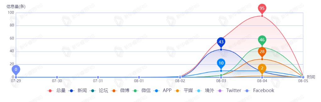 截至目前,该文章在互联网上传播总量共156篇。其中,8月4日是传播的高峰期,共传播95篇文章。各信源的信息发布情况中,新闻信息占比最大,其次是微信和微博,占比分别为33.33%、32.05%、19.87%。(数据来源:新华睿思·数媒智慧分析平台)