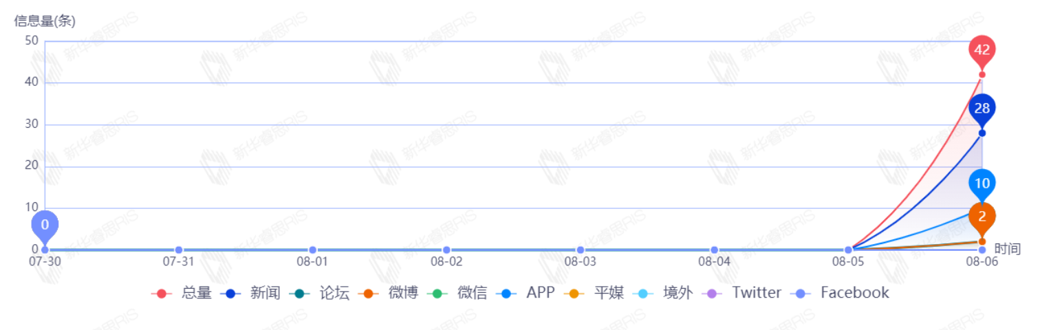 截至目前,该文章在互联网上传播总量共42篇。其中,8月6日是传播的高峰期,共传播42篇文章。各信源的信息发布情况中,新闻信息占比最大,其次是APP和论坛占比分别为66.67%、23.81%、4.76%。(数据来源:新华睿思·数媒智慧分析平台)