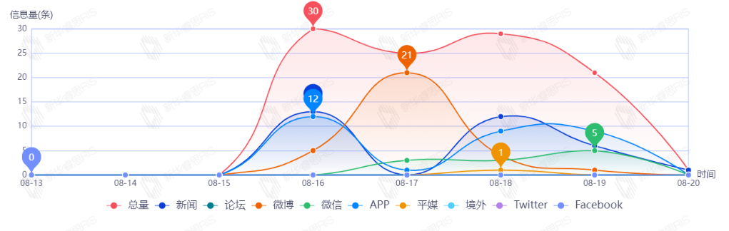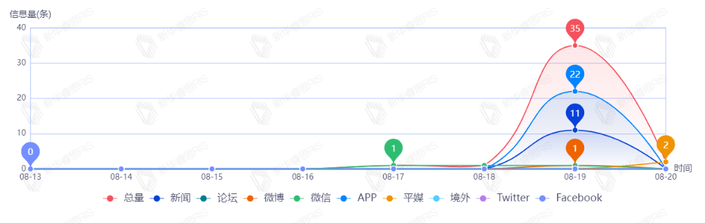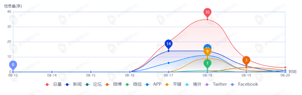 截至目前,该文章在互联网上传播总量67篇。其中8月18日是传播的高峰期,共传播35篇文章。各信源的信息发布情况中,新闻信息占比最大,其次是APP和平媒,占比分别为47.76%、28.36%、14.93%。(数据来源:新华睿思数据云图分析平台)
