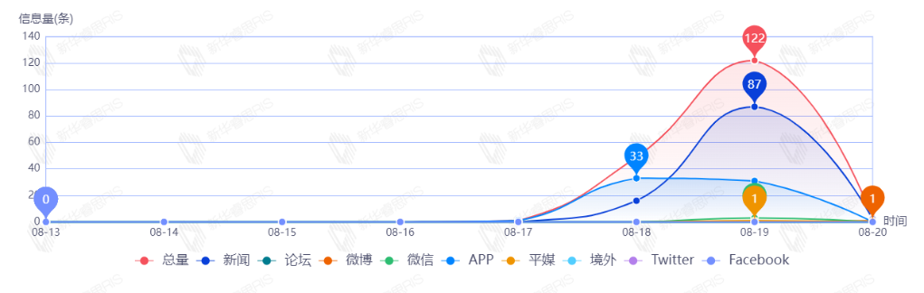 截至目前,该文章在互联网上传播总量175篇。其中8月19日是传播的高峰期,共传播122篇文章。各信源的信息发布情况中,新闻信息占比最大,其次是APP和微信,占比分别为60.00%、37.14%、1.71%。(数据来源:新华睿思数据云图分析平台)