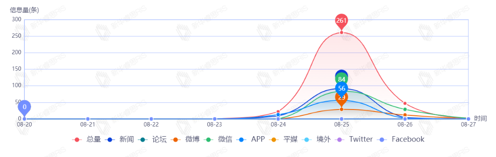 截至目前,该文章在互联网上传播总量333篇。其中8月25日是传播的高峰期,共传播261篇文章。各信源的信息发布情况中,微信信息占比最大,其次是新闻和APP,占比分别为34.53%、31.53%、21.62%。(数据来源:新华睿思数据云图分析平台)