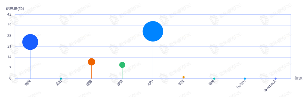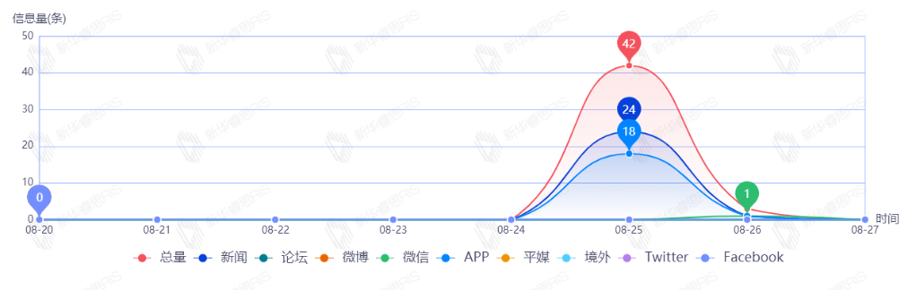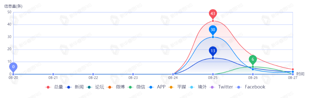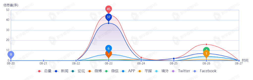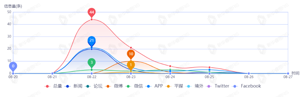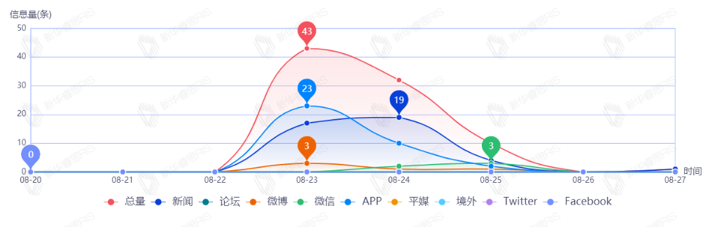 截至目前,该文章在互联网上传播总量86篇。其中8月23日是传播的高峰期,共传播43篇文章。各信源的信息发布情况中,新闻信息占比最大,其次是APP和微信,占比分别为47.67%、40.70%、5.81%。(数据来源:新华睿思数据云图分析平台)