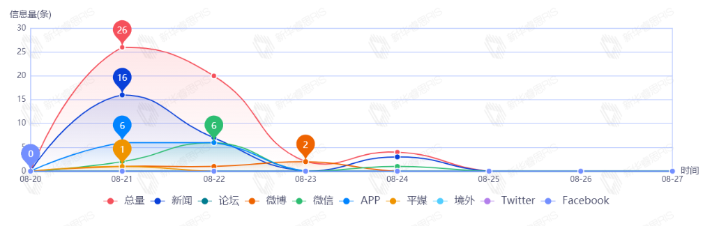 截至目前,该文章在互联网上传播总量66篇。其中8月23日是传播的高峰期,共传播45篇文章。各信源的信息发布情况中,新闻信息占比最大,其次是APP和微信,占比分别为71.21%、16.67%、7.58%。(数据来源:新华睿思数据云图分析平台)