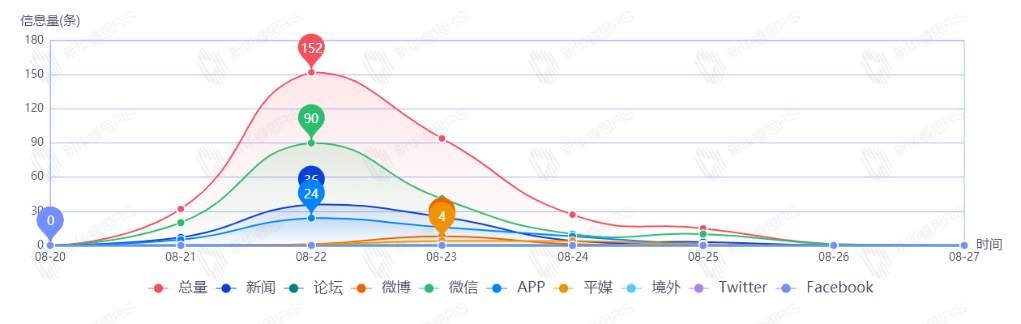 截至目前,该文章在互联网上传播总量321篇。其中8月22日是传播的高峰期,共传播152篇文章。各信源的信息发布情况中,微信信息占比最大,其次是新闻和APP,占比分别为53.58%、23.36%、16.82%。(数据来源:新华睿思数据云图分析平台)
