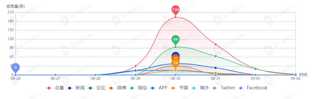截至目前,该文章在互联网上传播总量共352篇。其中,8月30日是传播的高峰期,共传播194篇文章。各信源的信息发布情况中,微信信息占比最大,其次是新闻和APP,占比分别为51.14%、22.16%、10.51%。(数据来源:新华睿思·数媒智慧分析平台)