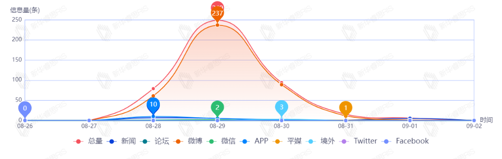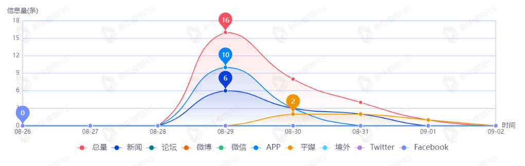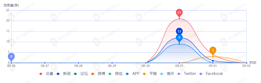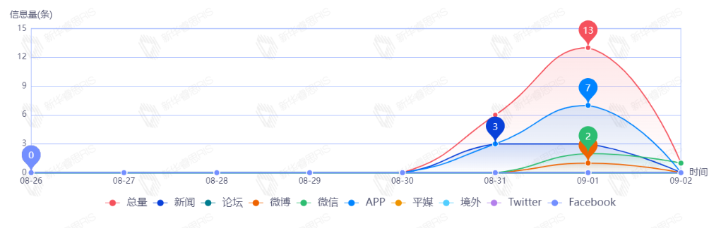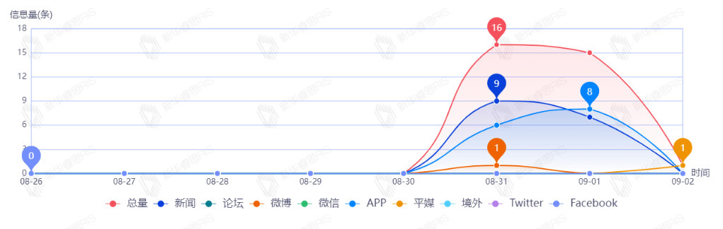 截至目前,该文章在互联网上传播总量共32篇。其中,8月31日是传播的高峰期,共传播16篇文章。各信源的信息发布情况中,新闻信息占比最大,其次是APP和平媒,占比分别为50.00%、43.75%、3.13%。(数据来源:新华睿思·数媒智慧分析平台)