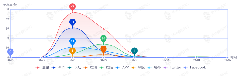 截至目前,该文章在互联网上传播总量共81篇。其中,8月28日是传播的高峰期,共传播47篇文章。各信源的信息发布情况中,新闻信息占比最大,其次是微信和APP,占比分别为45.68%、24.69%、23.46%。(数据来源:新华睿思·数媒智慧分析平台)