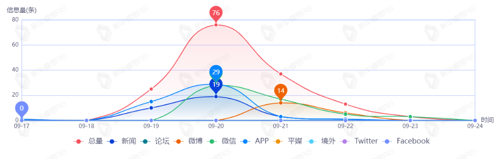 截至目前,该文章在互联网上传播总量155篇。其中9月20日是传播的高峰期,共传播76篇文章。各信源的信息发布情况中,微信信息占比最大,其次是APP和新闻,占比分别为34.19%、31.61%、21.29%。(数据来源:新华睿思数据云图分析平台)