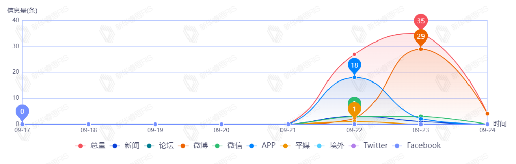 截至目前,该文章在互联网上传播总量66篇。其中9月23日是传播的高峰期,共传播35篇文章。各信源的信息发布情况中,微博信息占比最大,其次是APP和微信,占比分别为53.03%、30.30%、9.09%。(数据来源:新华睿思数据云图分析平台)
