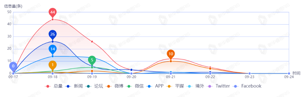 截至目前,该文章在互联网上传播总量90篇。其中9月18日是传播的高峰期,共传播44篇文章。各信源的信息发布情况中,新闻信息占比最大,其次是APP和微博,占比分别为41.57%、30.34%、17.98%。(数据来源:新华睿思数据云图分析平台)