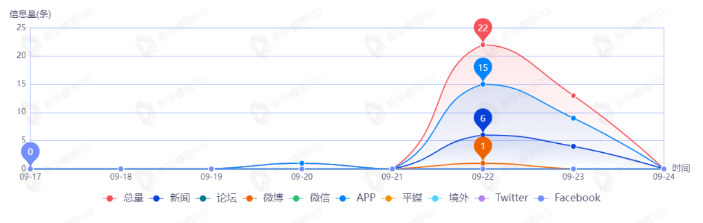 截至目前,该文章在互联网上传播总量36篇。其中9月22日是传播的高峰期,共传播22篇文章。各信源的信息发布情况中,APP信息占比最大,其次是新闻和微博,占比分别为69.44%、27.78%、2.78%。(数据来源:新华睿思数据云图分析平台)