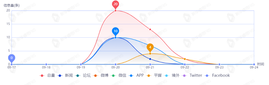 截至目前,该文章在互联网上传播总量35篇。其中9月20日是传播的高峰期,共传播20篇文章。各信源的信息发布情况中,APP信息占比最大,其次是新闻和平媒,占比分别为48.57%、34.29%、17.14%。(数据来源:新华睿思数据云图分析平台)