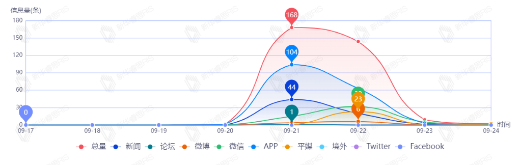 截至目前,该文章在互联网上传播总量325篇。其中9月21日是传播的高峰期,共传播168篇文章。各信源的信息发布情况中,APP信息占比最大,其次是新闻和微信,占比分别为52.78%、20.06%、16.36%。(数据来源:新华睿思数据云图分析平台)