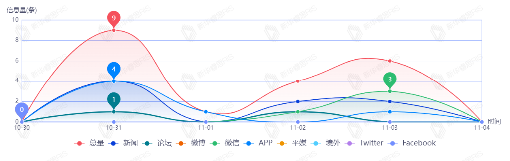截至目前,该文章在互联网上传播总量共20篇。其中,10月31日是传播的高峰期,共传播9篇文章。各信源的信息发布情况中,新闻信息占比最大,其次是APP,占比分别为42.11%和31.58%。(数据来源:新华睿思·数媒智慧分析平台)