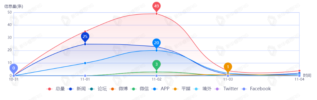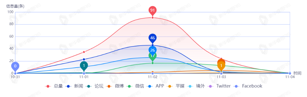 截至目前,该文章在互联网上传播总量共151篇。其中,11月2日是传播的高峰期,共传播91篇文章。各信源的信息发布情况中,新闻信息占比最大,其次是APP,占比分别为49.65%和38.67%。(数据来源:新华睿思·数媒智慧分析平台)