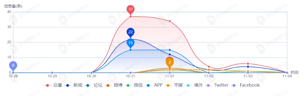 截至目前,该文章在互联网上传播总量共81篇。其中,10月31日是传播的高峰期,共传播37篇文章。各信源的信息发布情况中,新闻信息占比最大,其次是APP,占比分别为49.38%和37.04%。(数据来源:新华睿思·数媒智慧分析平台)