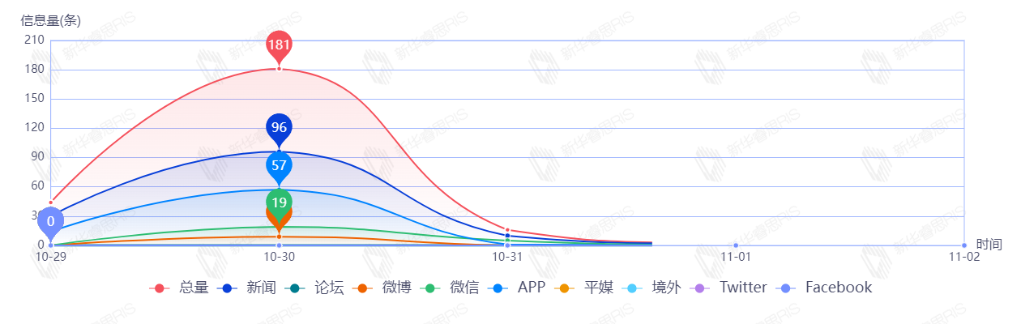 截至目前,该文章在互联网上传播总量共242篇。其中,10月30日是传播的高峰期,共传播181篇文章。各信源的信息发布情况中,新闻信息占比最大,其次是APP和微信,占比分别为57.32%、30.13%和8.79%。(数据来源:新华睿思·数媒智慧分析平台)
