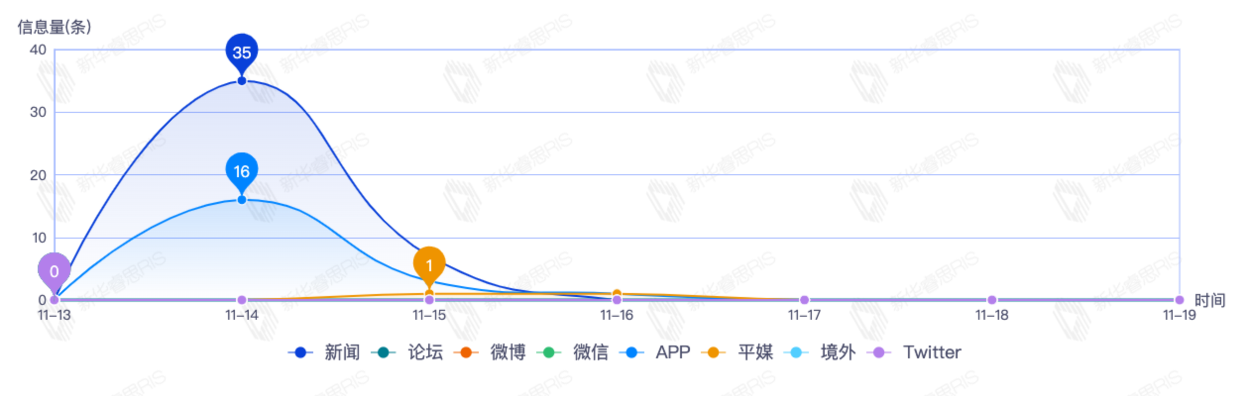 截至目前,该文章在互联网上传播总量共64篇。其中,11月14日是传播的高峰期,共传播35篇文章。各信源的信息发布情况中,其中新闻信息占比最大,其次是APP和平媒,信息量分别为37、20、2,占比分别为62.71%、33.90%、3.39%。(数据来源:新华睿思·数媒智慧分析平台)