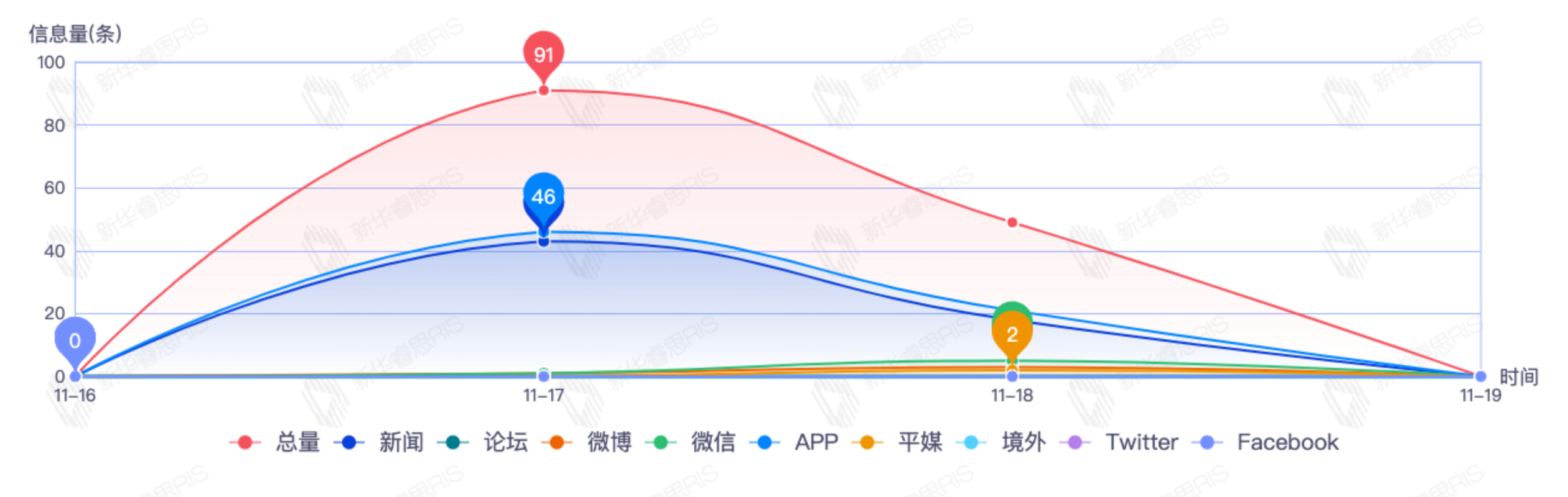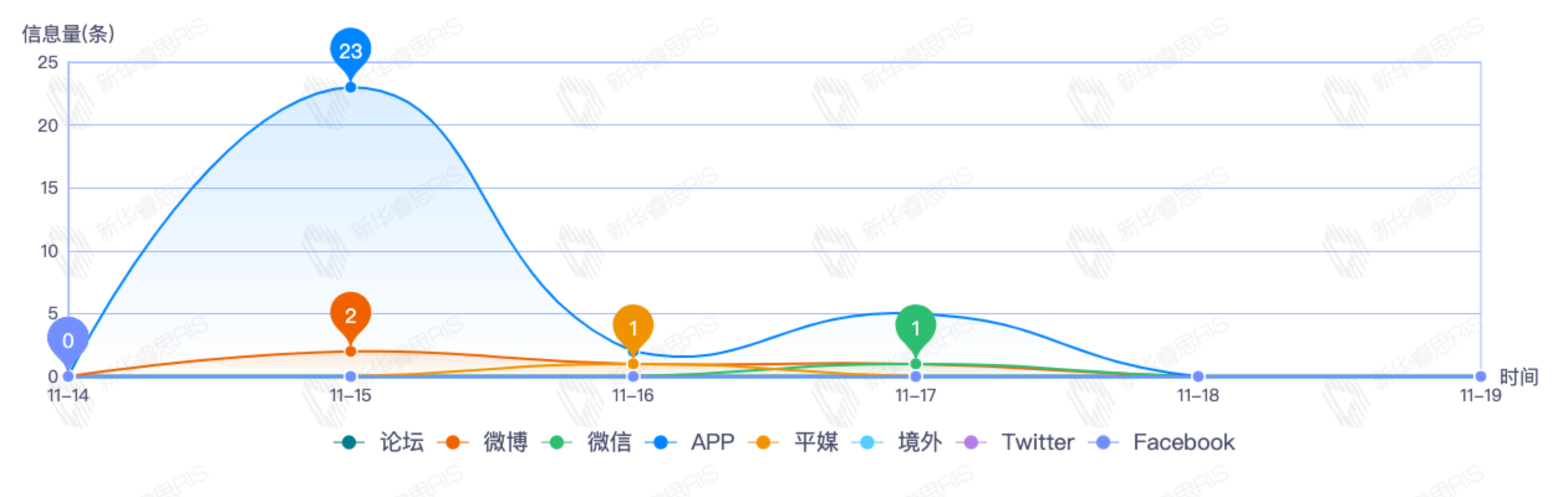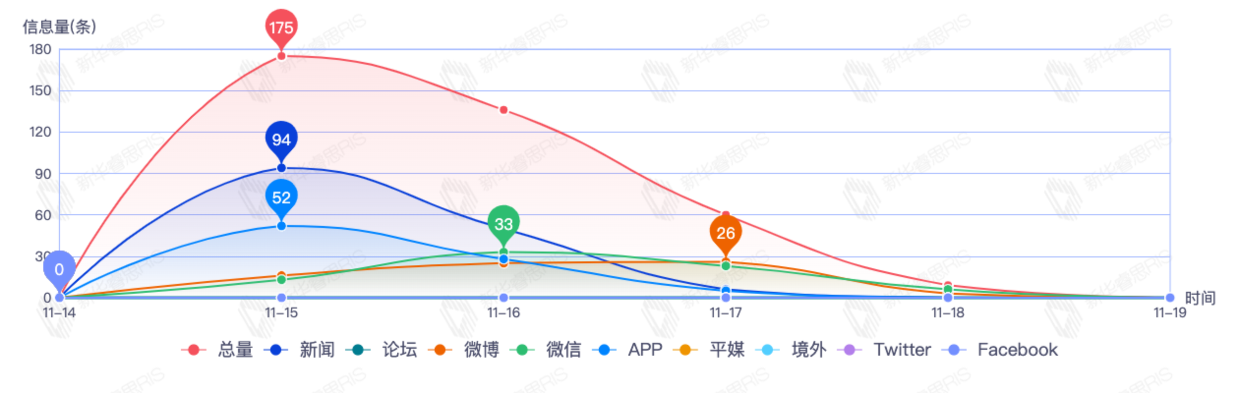截至目前,该文章在互联网上传播总量共380篇。其中,11月15日是传播的高峰期,共传播175篇文章。各信源的信息发布情况中,新闻信息占比最大,其次是APP和微博,信息量分别为116、85、70,占比分别为34.52%、25.30%、20.83%。(数据来源:新华睿思·数媒智慧分析平台)