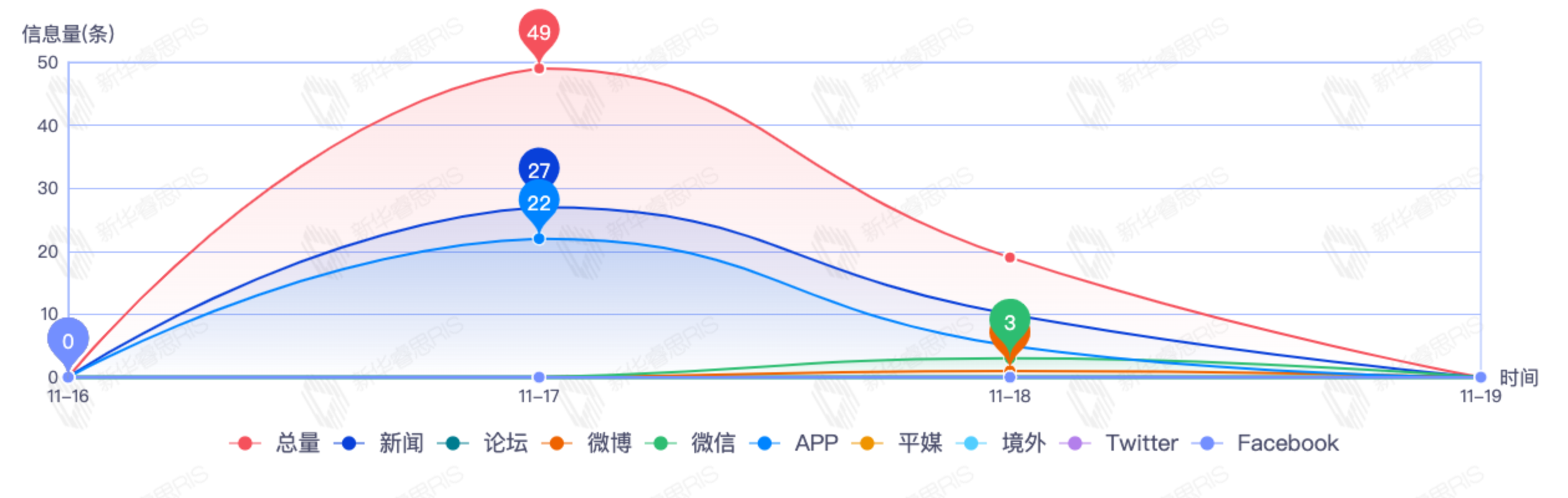 截至目前,该文章在互联网上传播总量共68篇。其中,11月17日是传播的高峰期,共传播49篇文章。各信源的信息发布情况中,其中新闻信息占比最大,其次是APP和微信,信息量分别为32、27、3,占比分别为50.79%、42.86%、4.76%。(数据来源:新华睿思·数媒智慧分析平台)