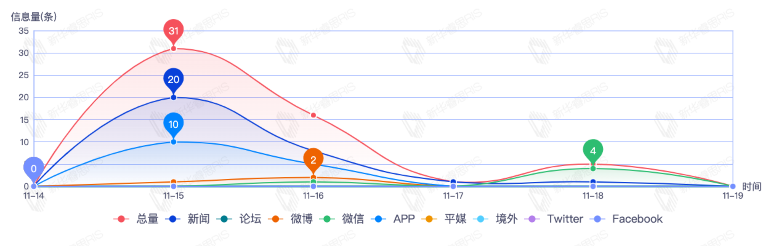 截至目前,该文章在互联网上传播总量共53篇。其中,11月15日是传播的高峰期,共传播31篇文章。各信源的信息发布情况中,其中新闻信息占比最大,其次是APP和微信,信息量分别为21、15、5,占比分别为47.73%、34.09%、11.36%。(数据来源:新华睿思·数媒智慧分析平台)