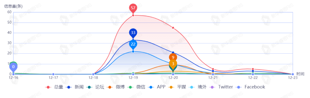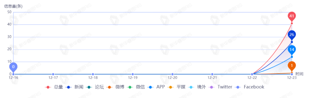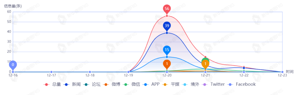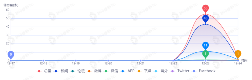 截至目前,该文章在互联网上传播总量共59篇。其中,12月23日是传播的高峰期,共传播55篇文章。各信源的信息发布情况中,新闻信息占比最大,其次是APP和平媒,占比分别为70.00%、24.00%、2.00%。(数据来源:新华睿思·数媒智慧分析平台)